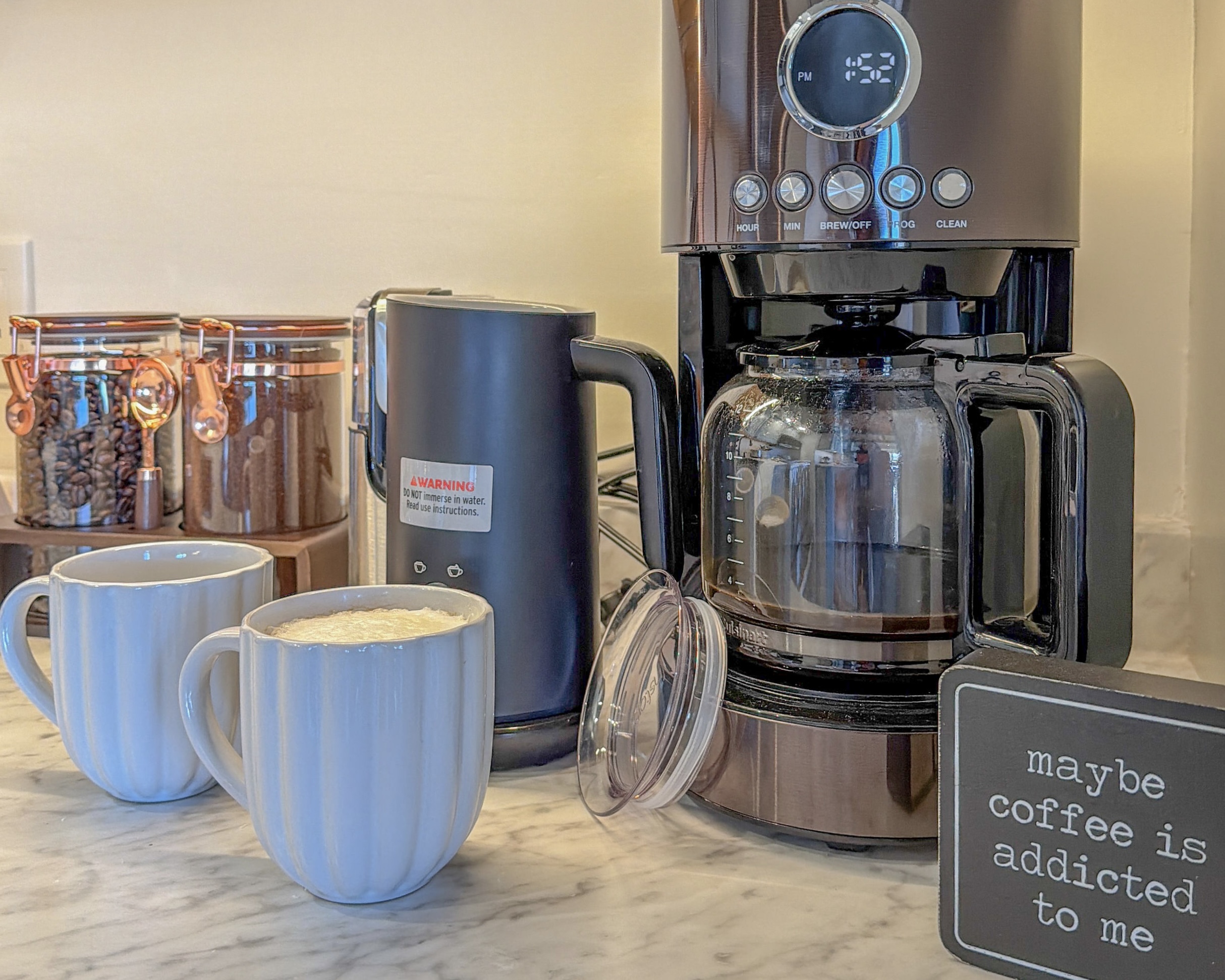 -Coffee Corner w/ coffee pot, coffee grinder, milk frother